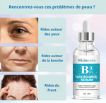 - Réduction des rides et des fines lignes : La niacinamide (vitamine B3) agit en profondeur pour lisser la peau et lui donner un aspect jeune.